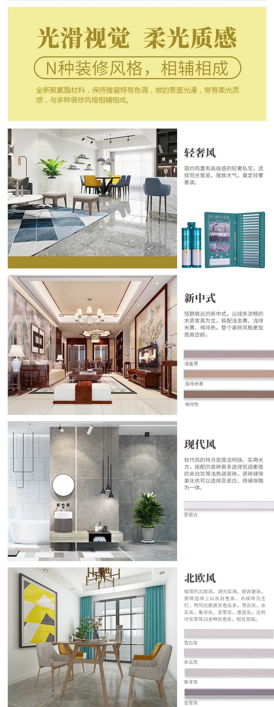 产品特点:吉祥卓高阳光雅瓷属于柔光色系,可以做到瓷砖与缝隙融为一体,为业主打造简约而富有高级感的轻奢私宅。为卓高合伙人专属产品,客户专属定制,打造一砖一色美缝。