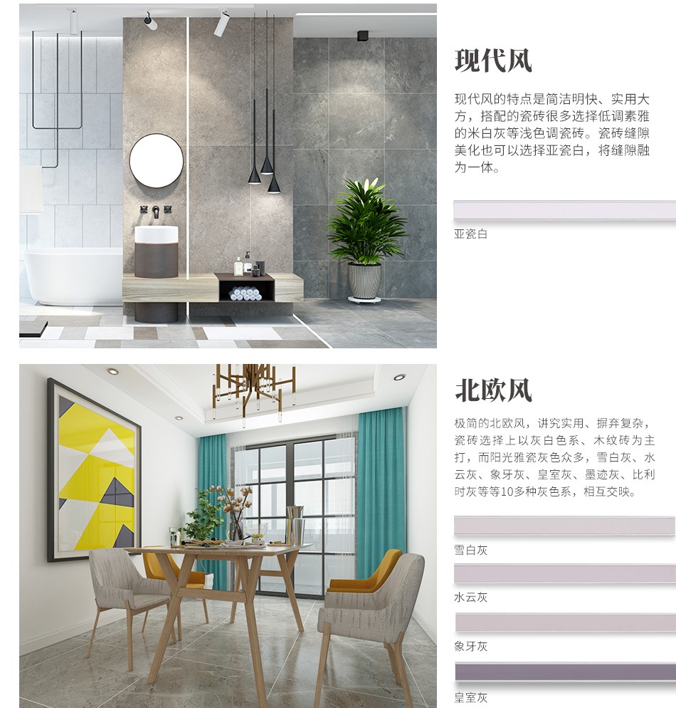 产品特点:阳光雅瓷属于柔光色系,可以做到瓷砖与缝隙融为一体,为业主打造简约而富有高级感的轻奢私宅。