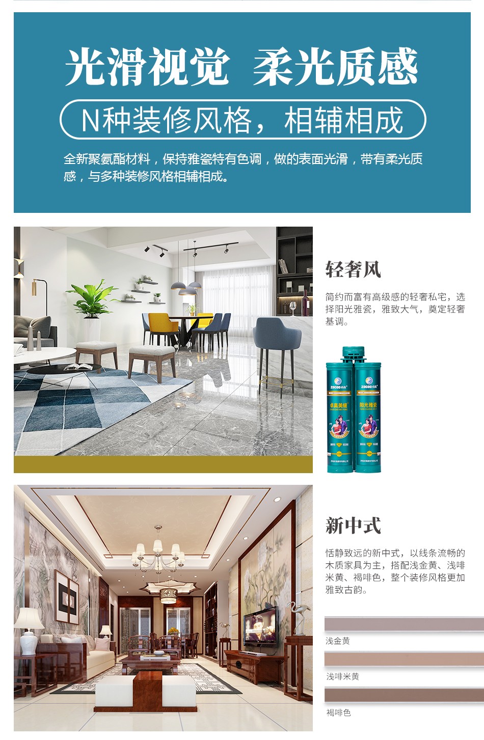 产品特点:阳光雅瓷属于柔光色系,可以做到瓷砖与缝隙融为一体,为业主打造简约而富有高级感的轻奢私宅。